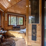 房间很有特色,老板考虑到带着孩子,为了更好的舒适度,给免费升级了房型,孩子可以撒着欢看电视。泡汤是孩子心心念念的,里面干净卫生,很有特色玩,可以放心泡。早上的早餐老公和孩子(我感冒了没去吃)都评价很高,说包子都是自己做的,他们吃了好几个,菜也是自己重的。冬季院内景色没有图片那么明艳,但小细节可以看出老板的用心布置,水池那厚厚的大冰块孩子也玩得很开心。走前孩子自己拿着手机边走边录了一圈,说是提醒自己不要忘记了这,下次还要来。